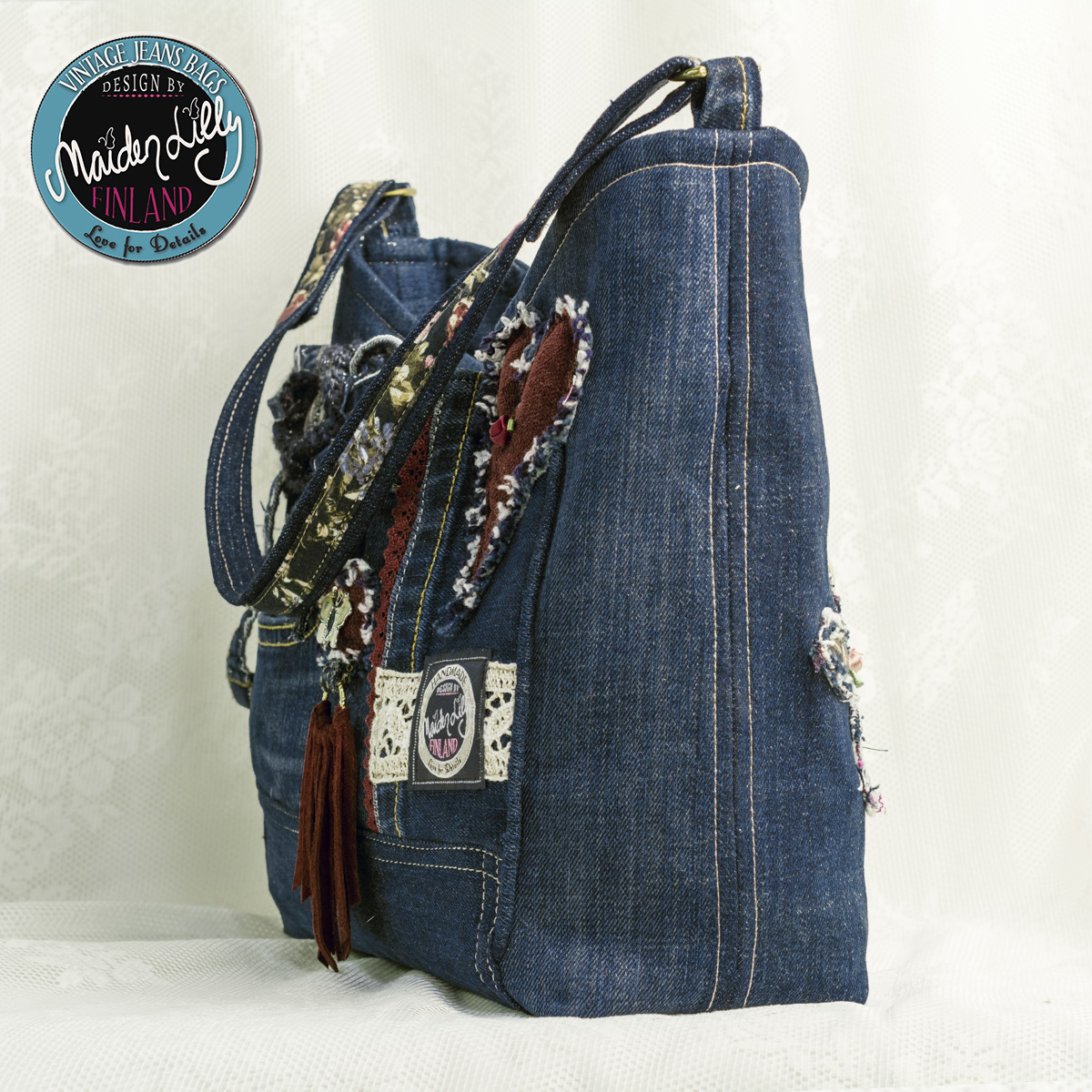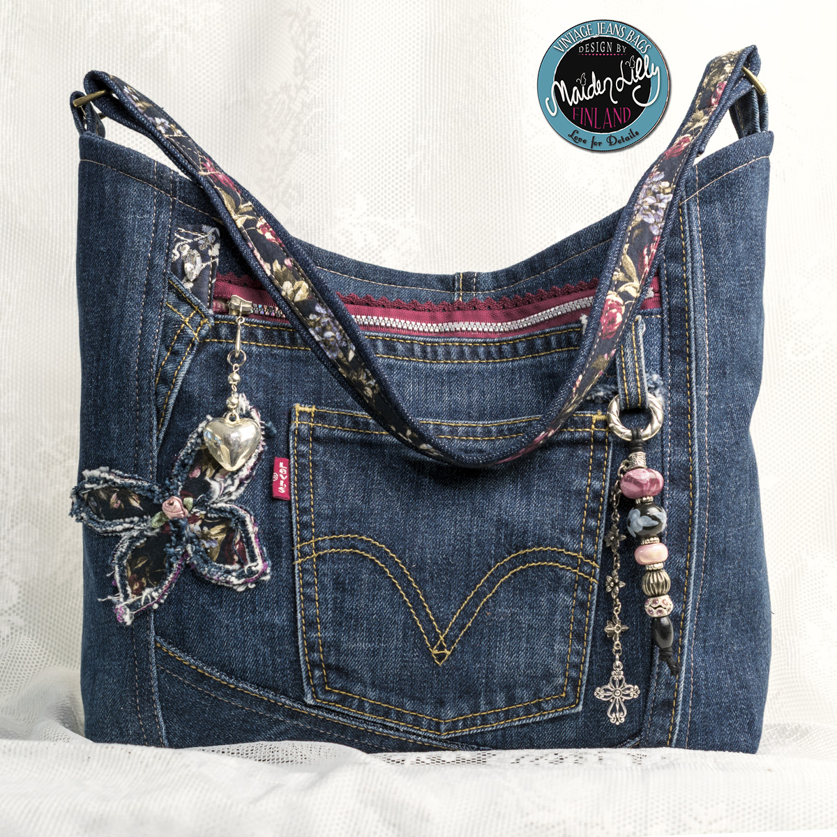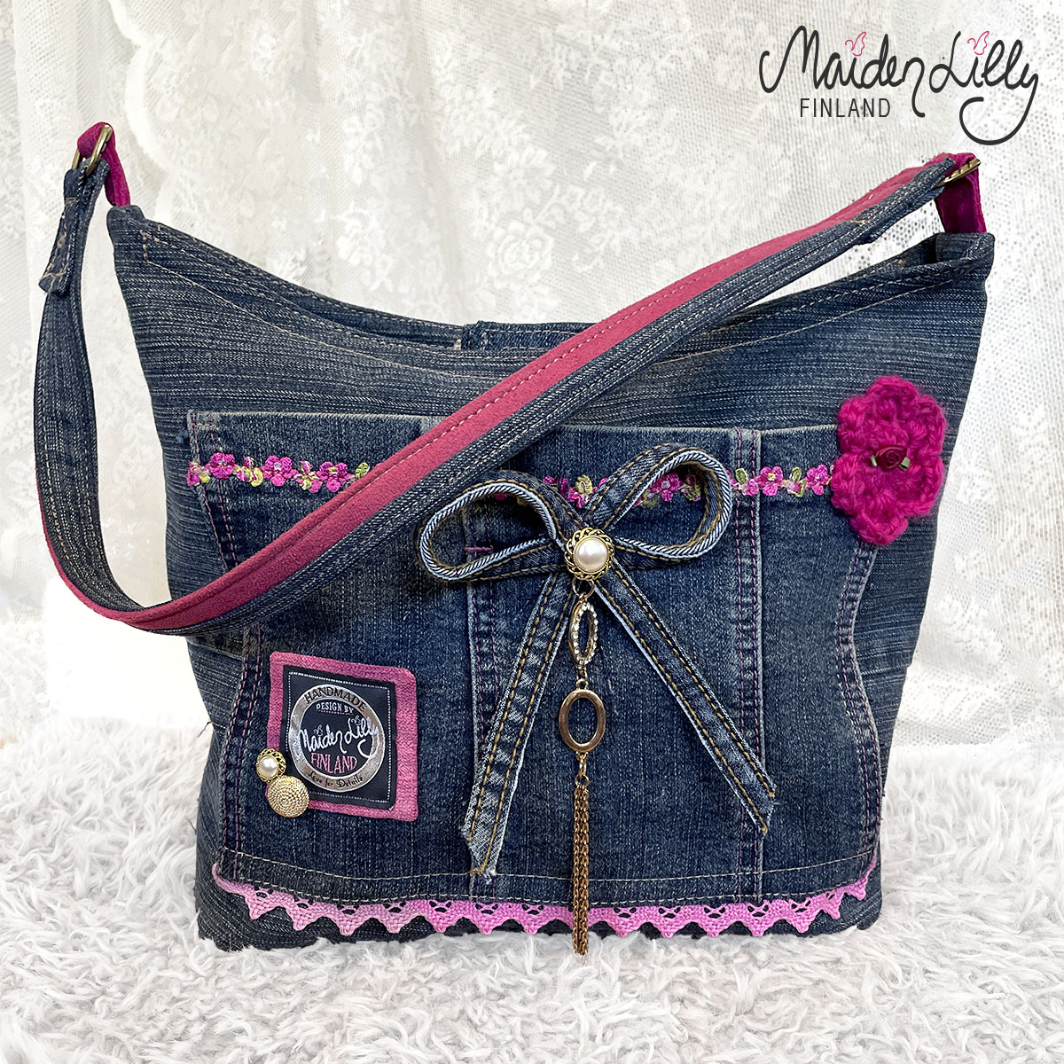 Lilly’s Book Bagia on tällä hetkellä saatavilla ainoastaan tilaustuotteena. Tilaustuotteiden farkun värisävy, yksityiskohdat, somisteet ja tehostevärit  sovitaan asiakkaan kanssa ennen tilausta. Hinta muodostuu valmiin laukun materiaalien ja yksityiskohtien määrästä. Ovh. 130-185 €.