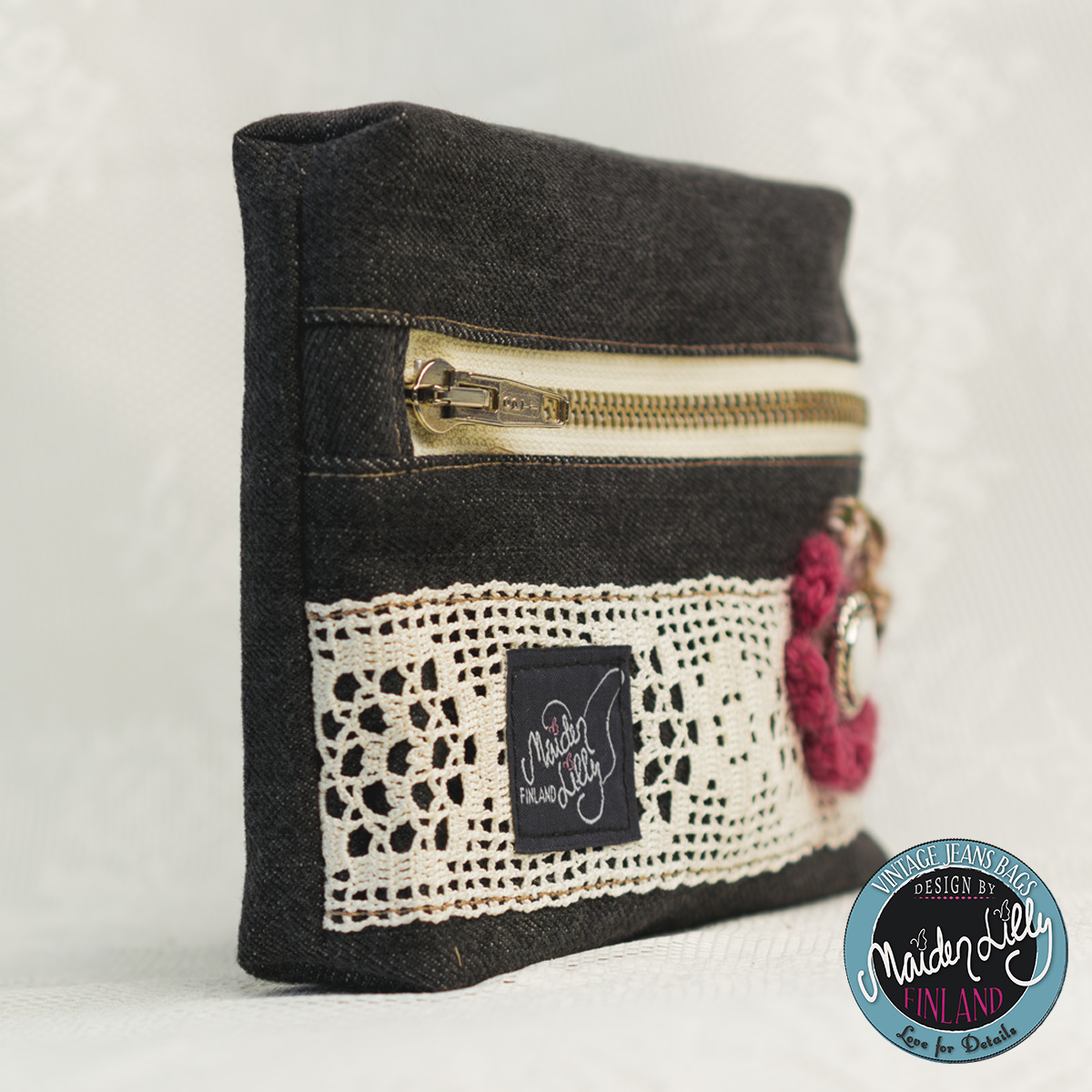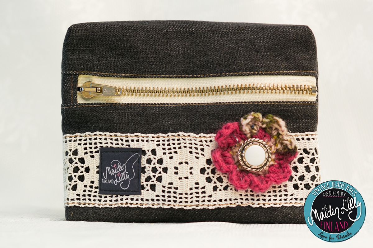 Perusmateriaalina harmaanmusta kierrätysfarkku. Somisteena luonnonvalkoista, nyplättyä pitsiä ja villakukka valkoisella, hopeareunuksisella napilla. Luonnonvalkoinen metalliketju hopeanvärisellä hammastuksella.