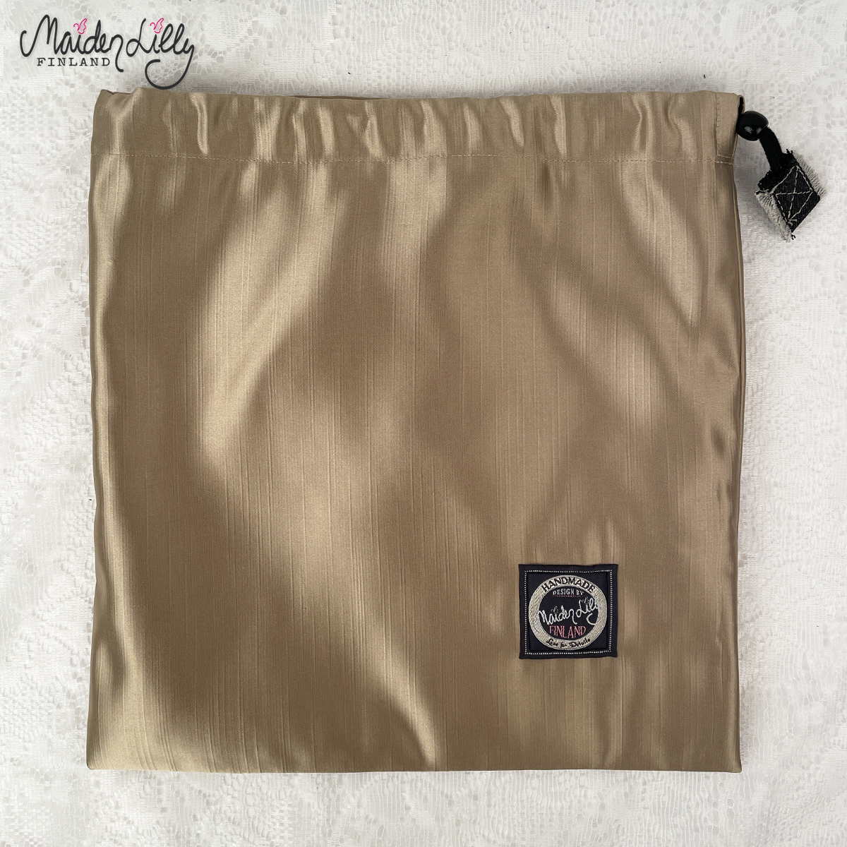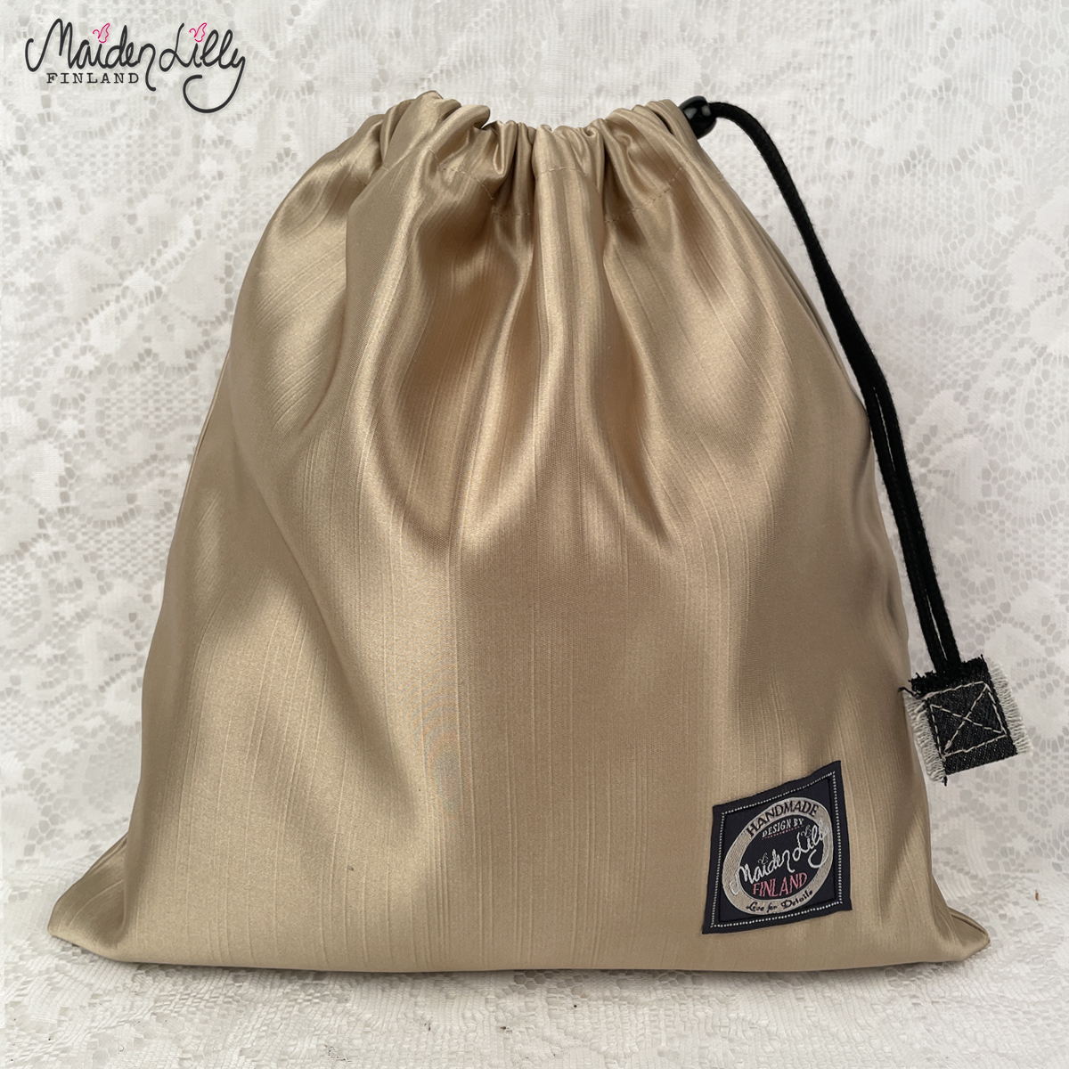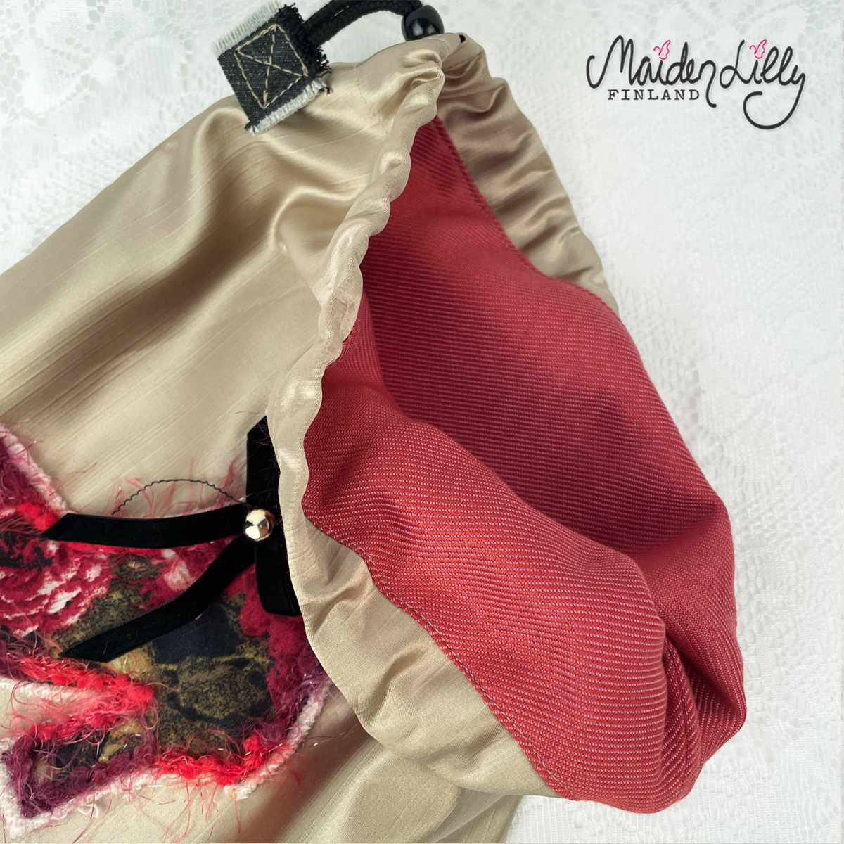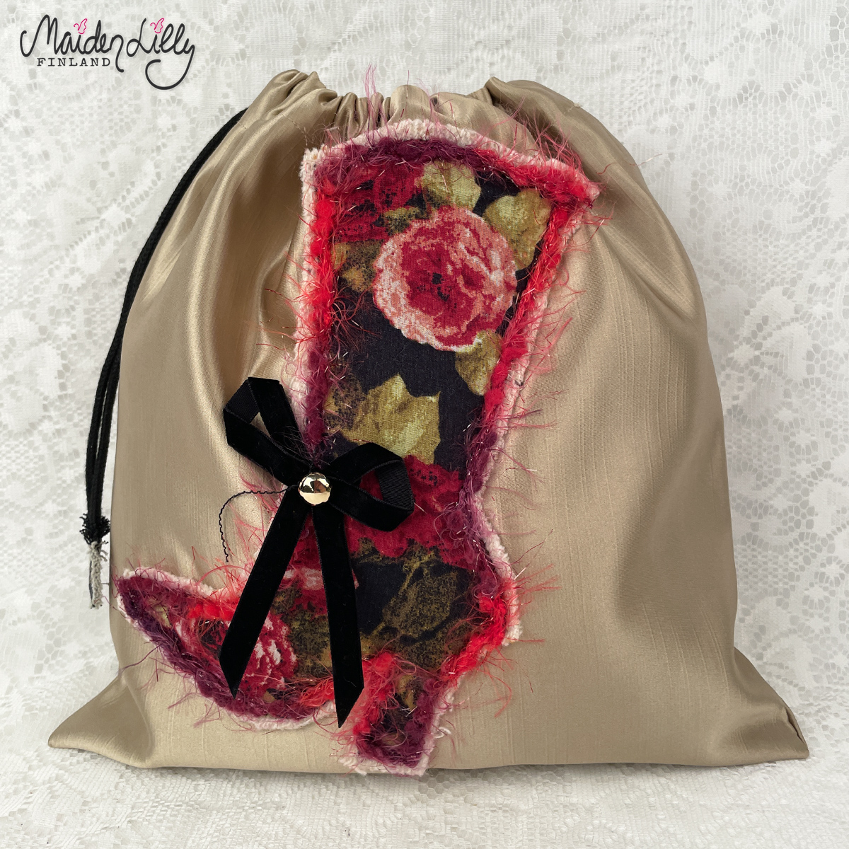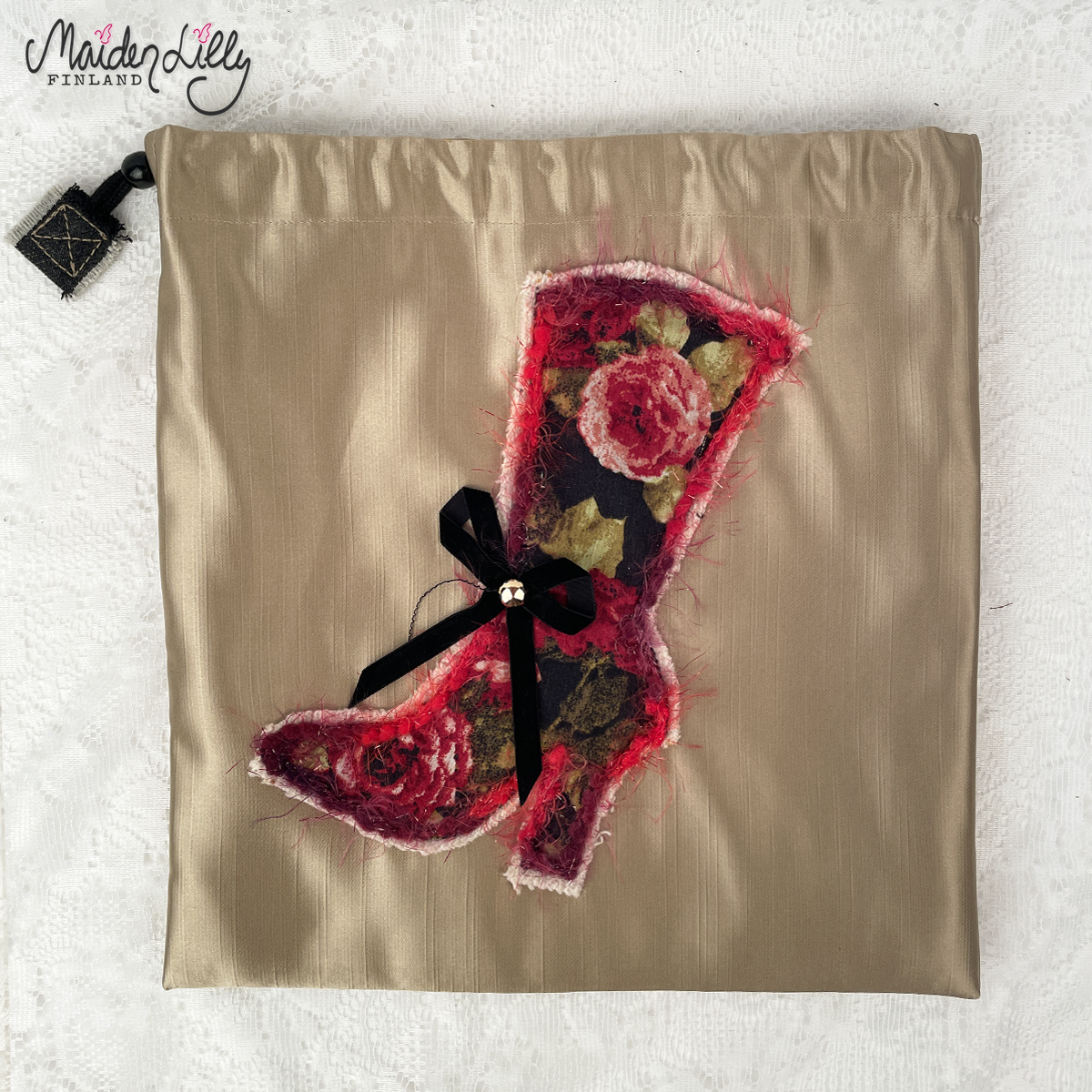 Päälliskankaan materiaalina uutta, paksua verhosatiinia, löytö kangaskaupan palalaarista. Värinä mattakultainen beige. Pussukan etupuolella applikoitu, monivärinen korkokenkä ruusukuosista puuvillaa. Reunuskoristeina villakangasta raakareunalla ja villalankanauhaa. Somisteena musta samettirusetti kultanapilla. Applikaation korkeus on n. 22 cm. Yläosassa musta kiristysnyöri mustalla puunapilla.