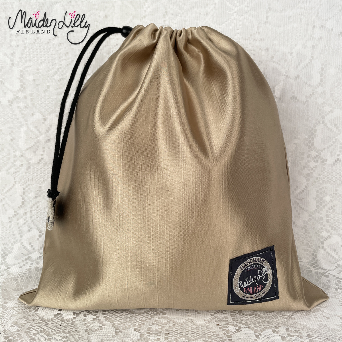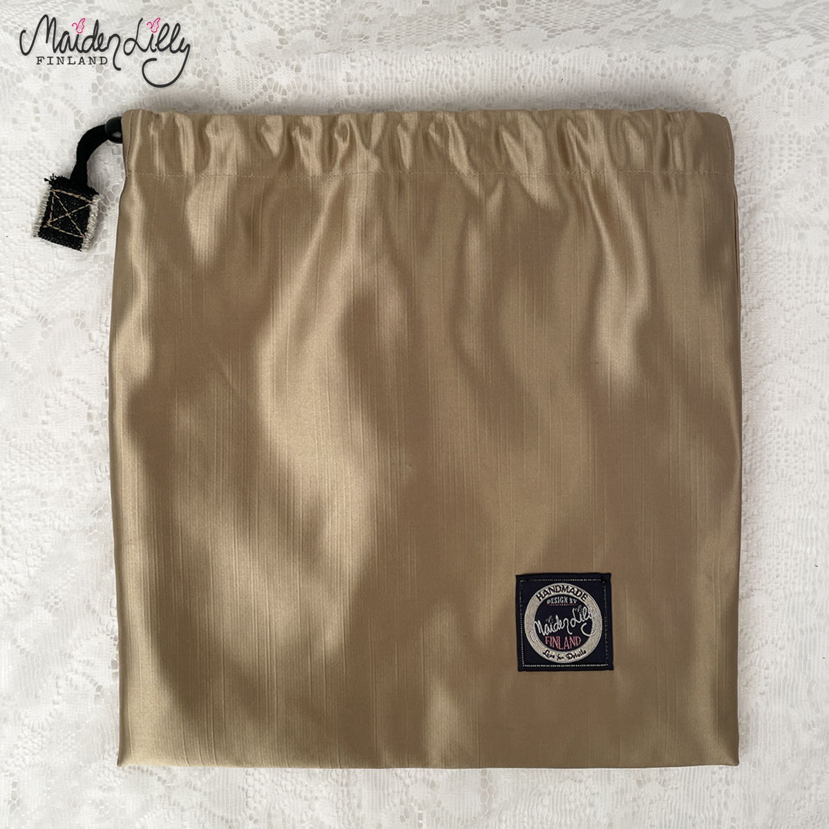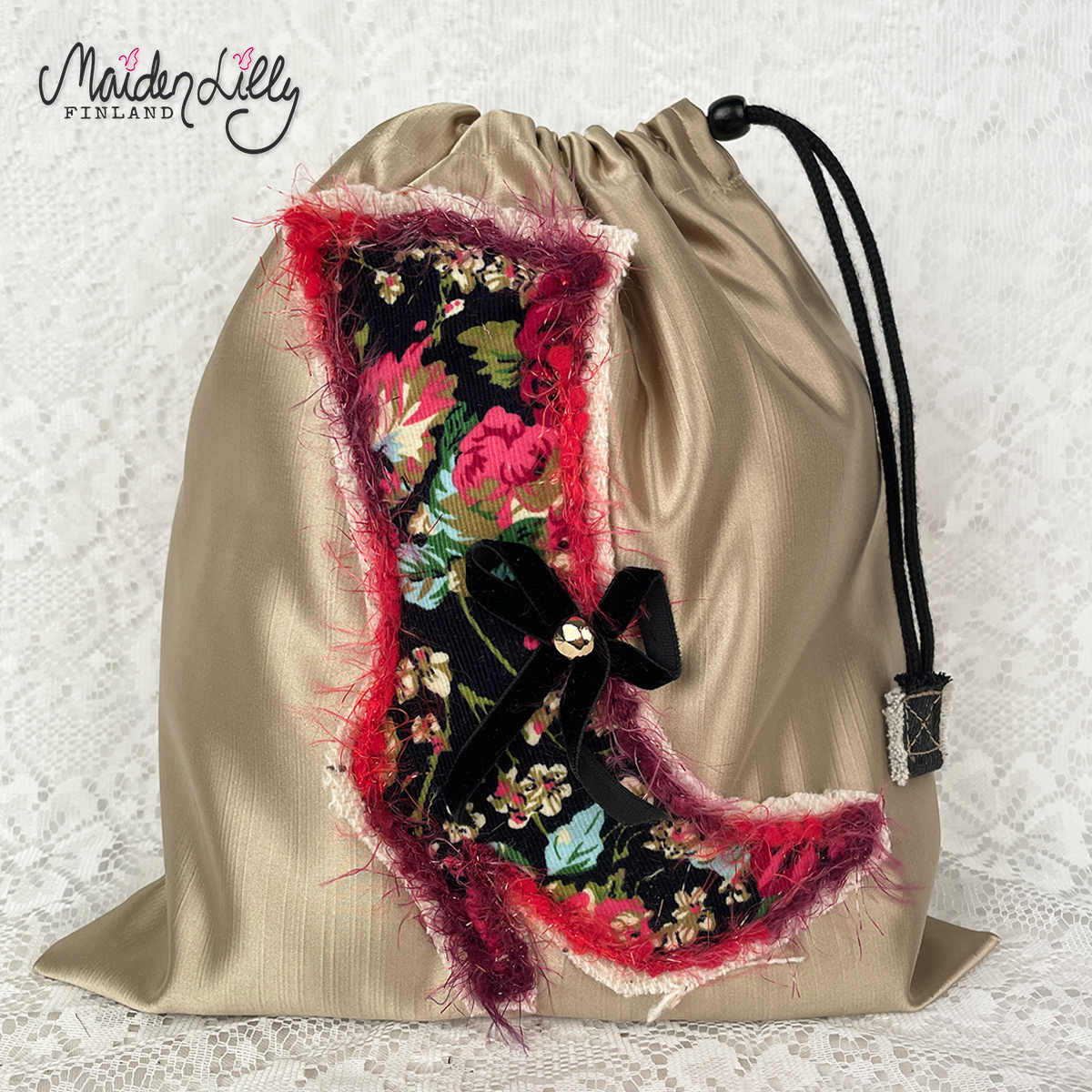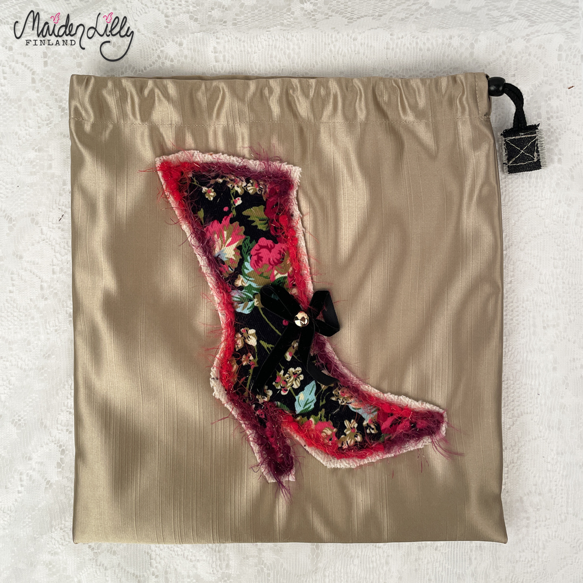 Päälliskankaan materiaalina uutta, paksua verhosatiinia, löytö kangaskaupan palalaarista. Värinä mattakultainen beige. Pussukan etupuolella applikoitu, monivärinen korkokenkä kukkakuosista vakosamettia. Reunuskoristeina villakangasta raakareunalla ja villalankanauhaa. Somisteena musta samettirusetti kultanapilla. Applikaation korkeus on n. 22 cm. Yläosassa musta kiristysnyöri mustalla puunapilla.