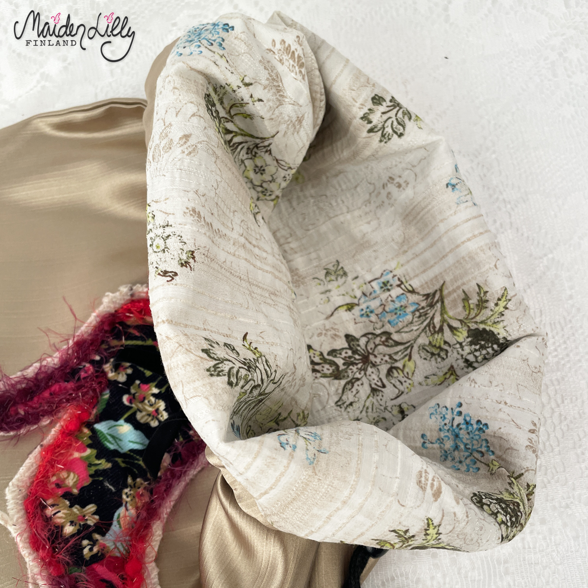 Sisäpuoli vuoritettu vaalealla, ohuella kreppi/sekoitekankaalla. Kaunis kukkakuosi, jonka sävyissä vaaleanruskeaa ja turkoosia.