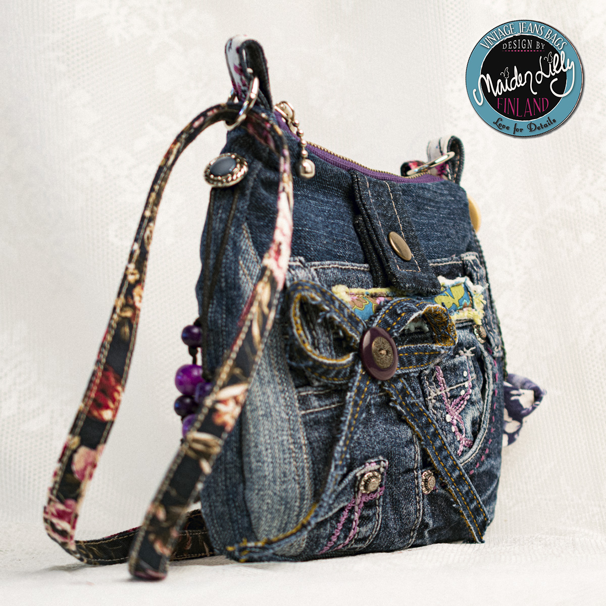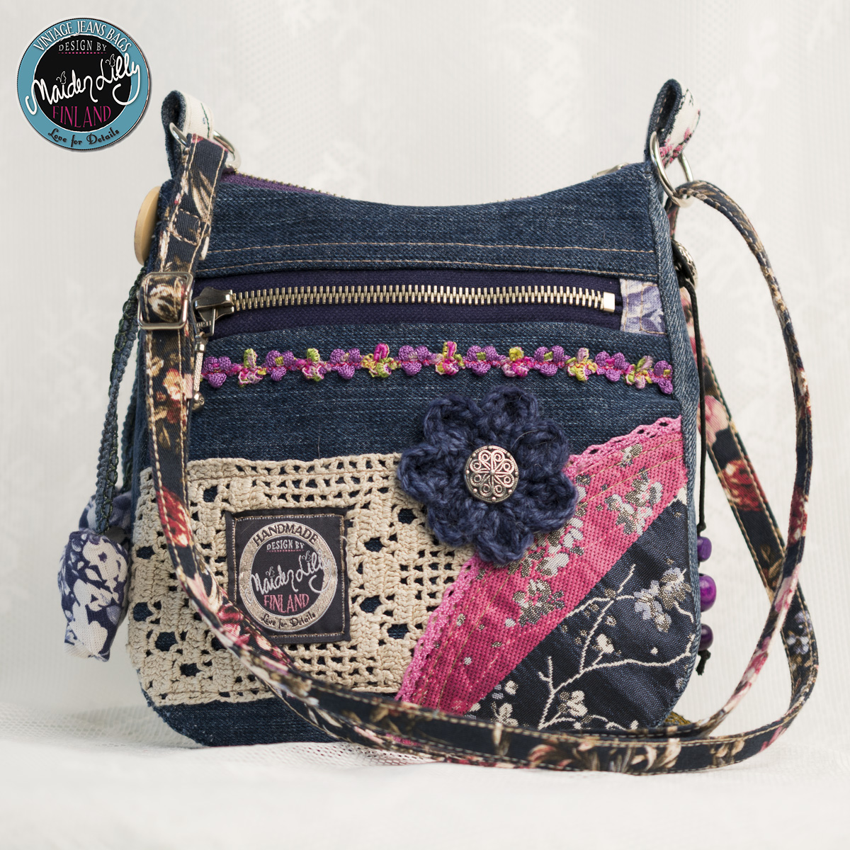 Lilly’s Little Bag on Maiden Lilly Finlandin oman malliston tuote, suunniteltu ja valmistettu oman ateljeen ompelimossa, Torniossa. Päämateriaalina kierrätysfarkku, muut osat ja somisteet kierrätysmateriaalia, ylijäämää ja uutta materiaalia sopivasti yhdistellen. Saumat on ommeltu vahvalla langalla teollisuusompelukoneilla. Yksityiskohdat käsin ommeltu ja viimeistelty.