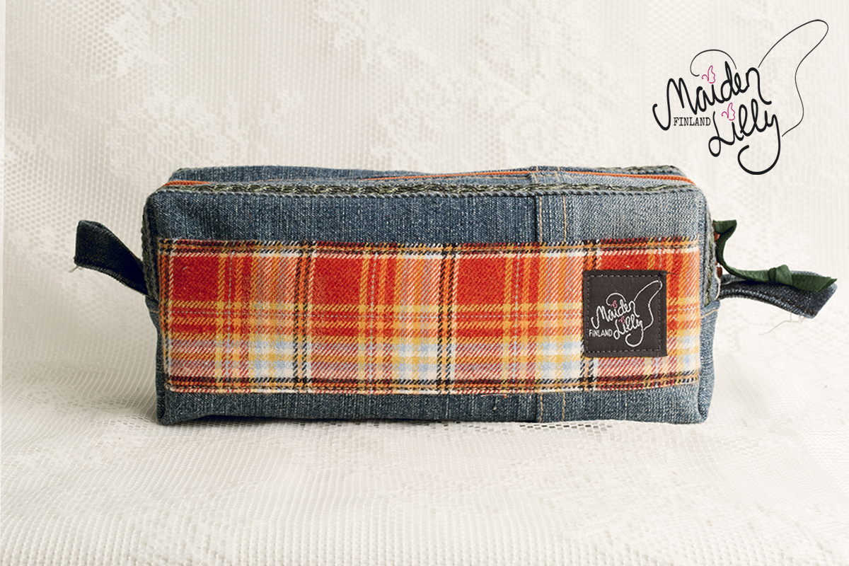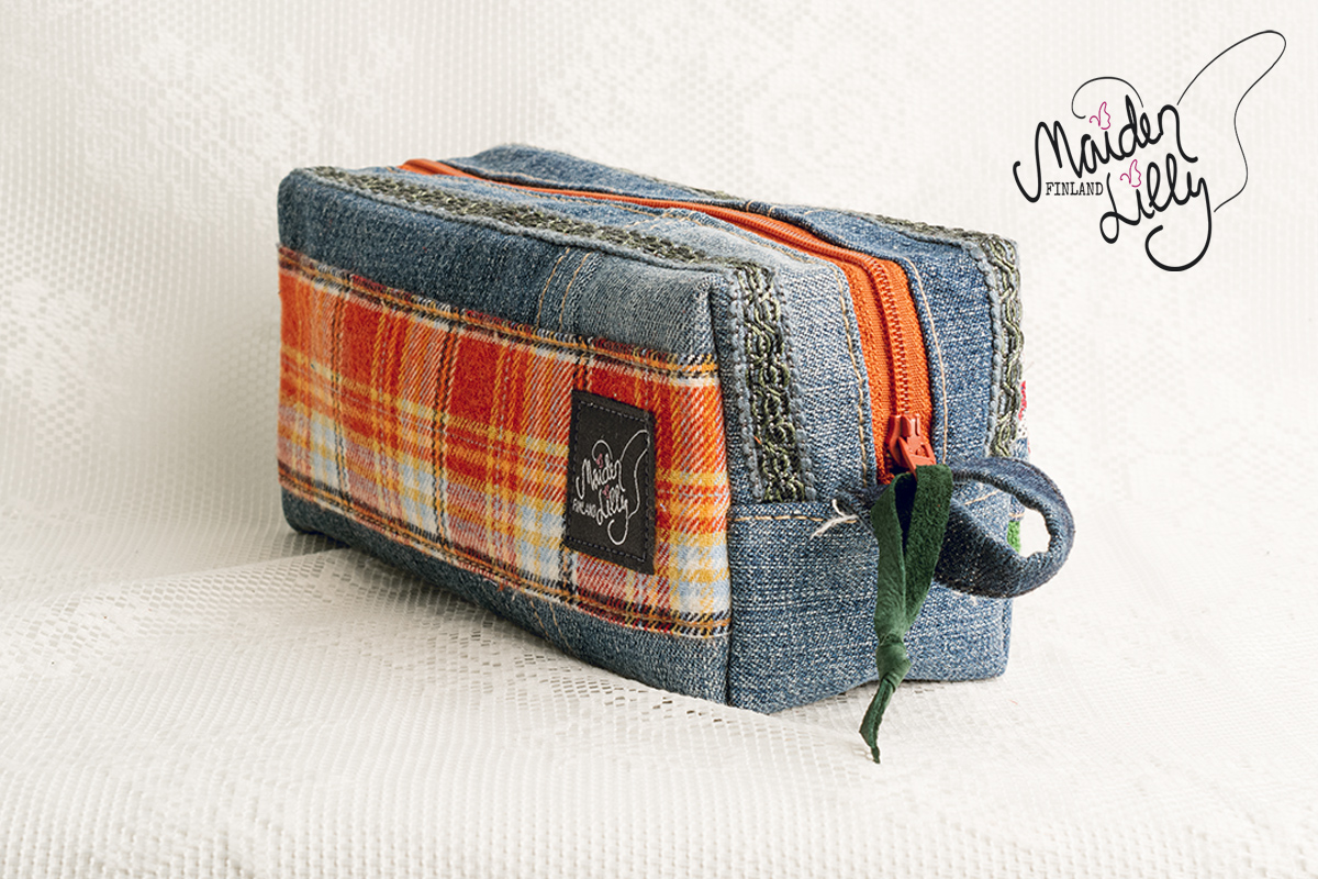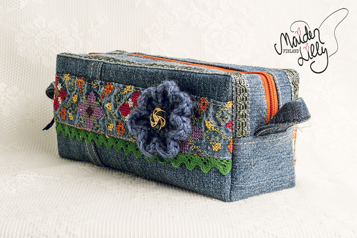 Perusmateriaalina keskisininen kierrätysfarkku, somisteet ja yksityiskohdat värikkäästi retrovivahtein. Somisteena värikästä ristipistoin koristeltua denimiä, alaosassaan retrovihreä koristepitsi puuvillaa. Yksityiskohtana sininen virkattu villakukka vihreä/kultaisella koriste napilla. Takapuolella somisteena ruudullista ohutta flanellikangasta. Harmaa vetoketju, avaamista helpottaa sininen nahkanauha vetimessä. Vetoketjun molemmin puolin sinivihreää koristenauhaa. Päädyissä käyttöä helpottavat farkkulenkit.