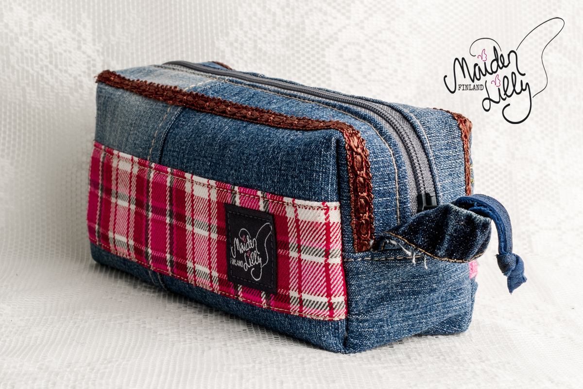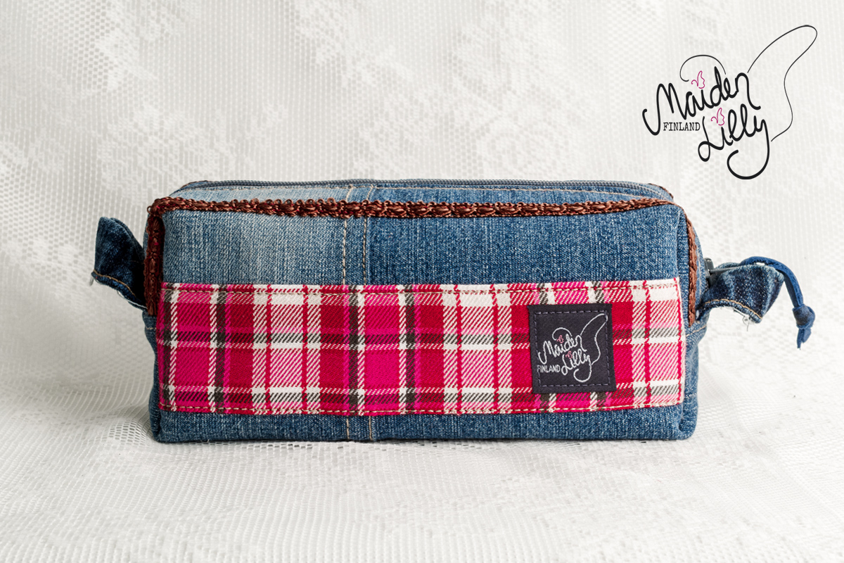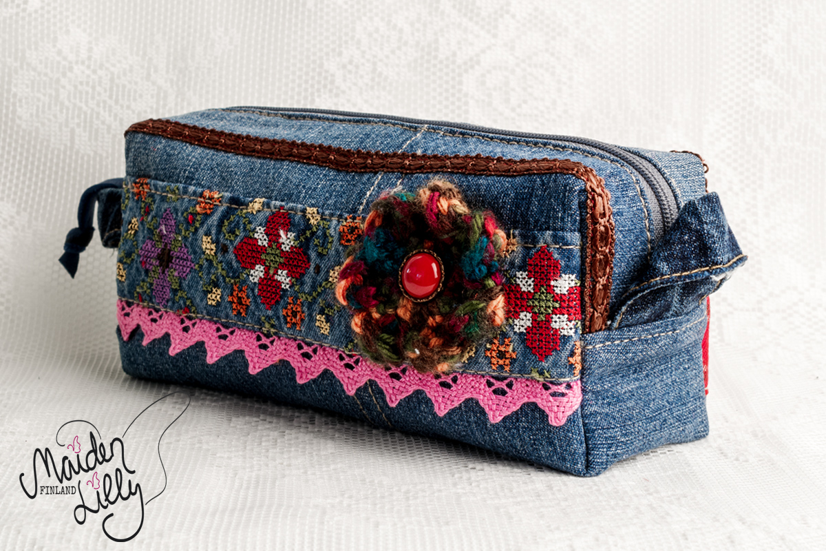 Perusmateriaalina keskisininen kierrätysfarkku, somisteet ja yksityiskohdat värikkäästi retrovivahtein. Somisteena värikästä ristipistoin koristeltua denimiä, alaosassaan pinkki koristepitsi puuvillaa. Yksityiskohtana monivärinen virkattu villakukka pronssisella punaisella napilla. Takapuolella somisteena ruudullista ohutta villakangasta. Harmaa vetoketju, avaamista helpottaa sininen nahkanauha vetimessä. Vetoketjun molemmin puolin ruskeaa koristenauhaa. Päädyissä käyttöä helpottavat farkkulenkit.