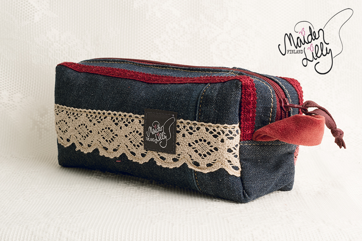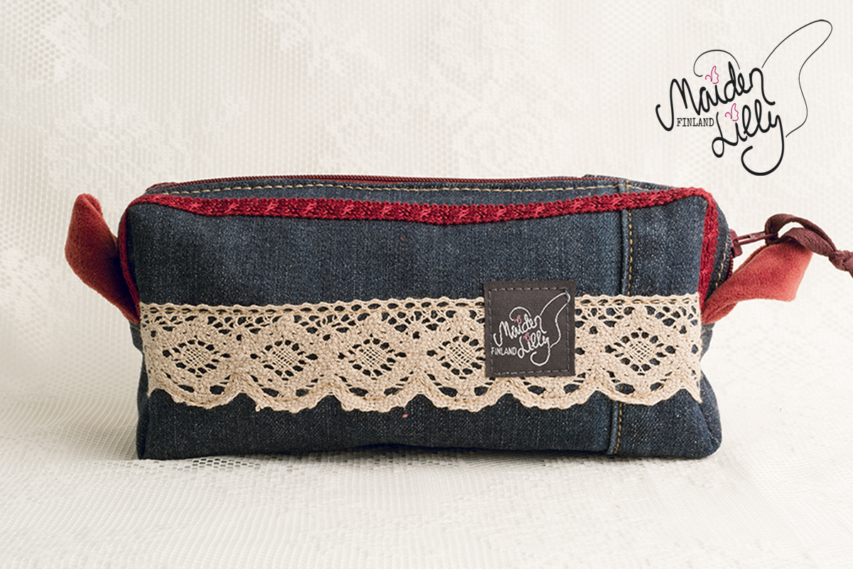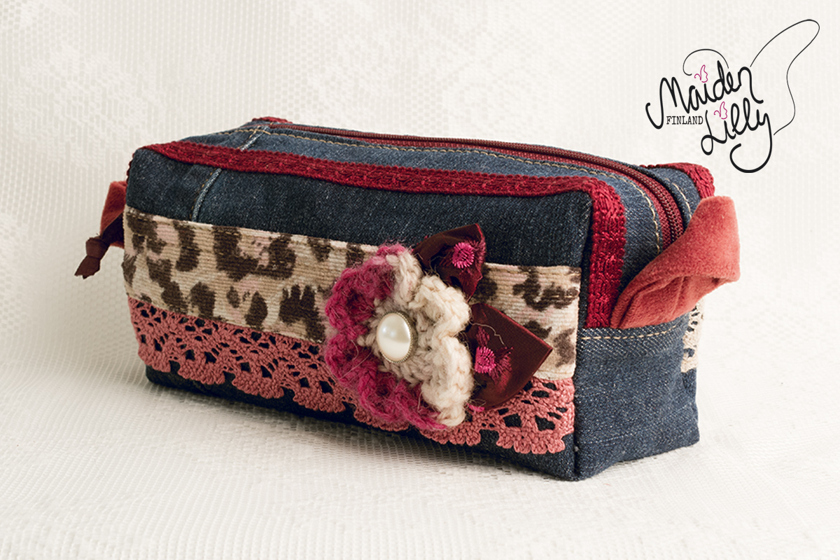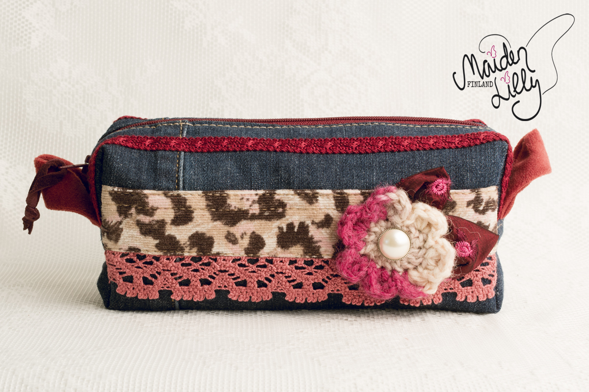Perusmateriaalina tummansininen kierrätysfarkku, somisteet ja yksityiskohdat harkiten valittu. Somisteena leopardikuosista, beige/ruskeaa vakosamettia aavistuksella vaaleanpunaista, alaosassaan vanhanroosa koristepitsi puuvillaa. Yksityiskohtana beige/burgundi virkattu villakukka viininpunaisin satiinisin terälehdin ja helmiäisnapilla. Takapuolella somisteena khakibeigeä, virkattua pitsiä. Viininpunainen vetoketju, avaamista helpottaa nahkanauha vetimessä. Vetoketjun molemmin puolin viininpunaista koristenauhaa. Päädyissä käyttöä helpottavat leveät kangaslenkit pehmeää, tummanroosaa samettia.